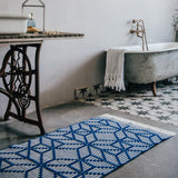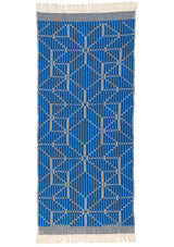 LANOUR szőnyegünkön a szövés módjából fakadóan a mintázat mindkét oldalon inverzben jelenik meg. A mélykék szín, a letisztult geometria és a vonalas mintázat a legkülönbözőbb kortárs terekbe beilleszthető.